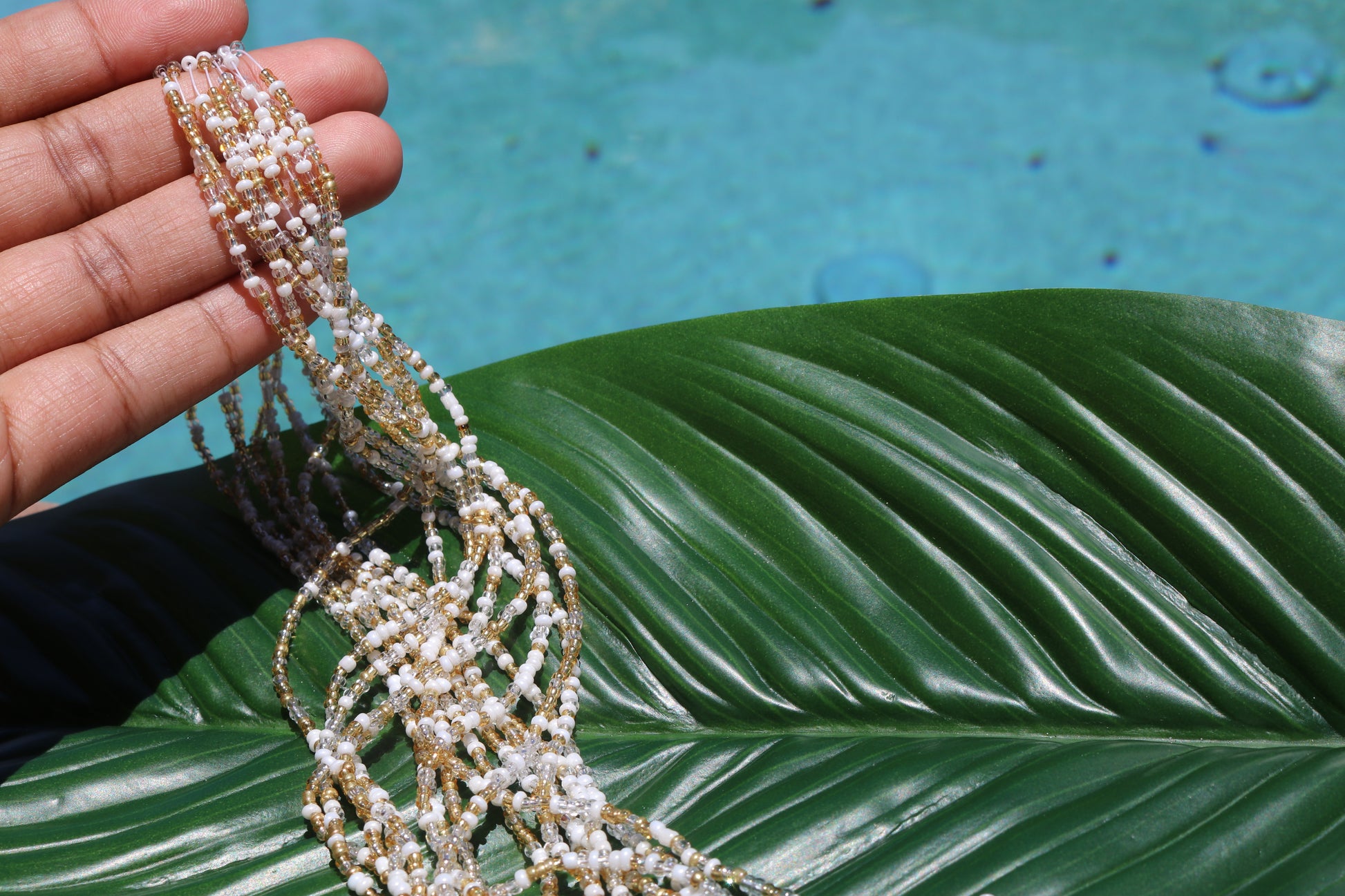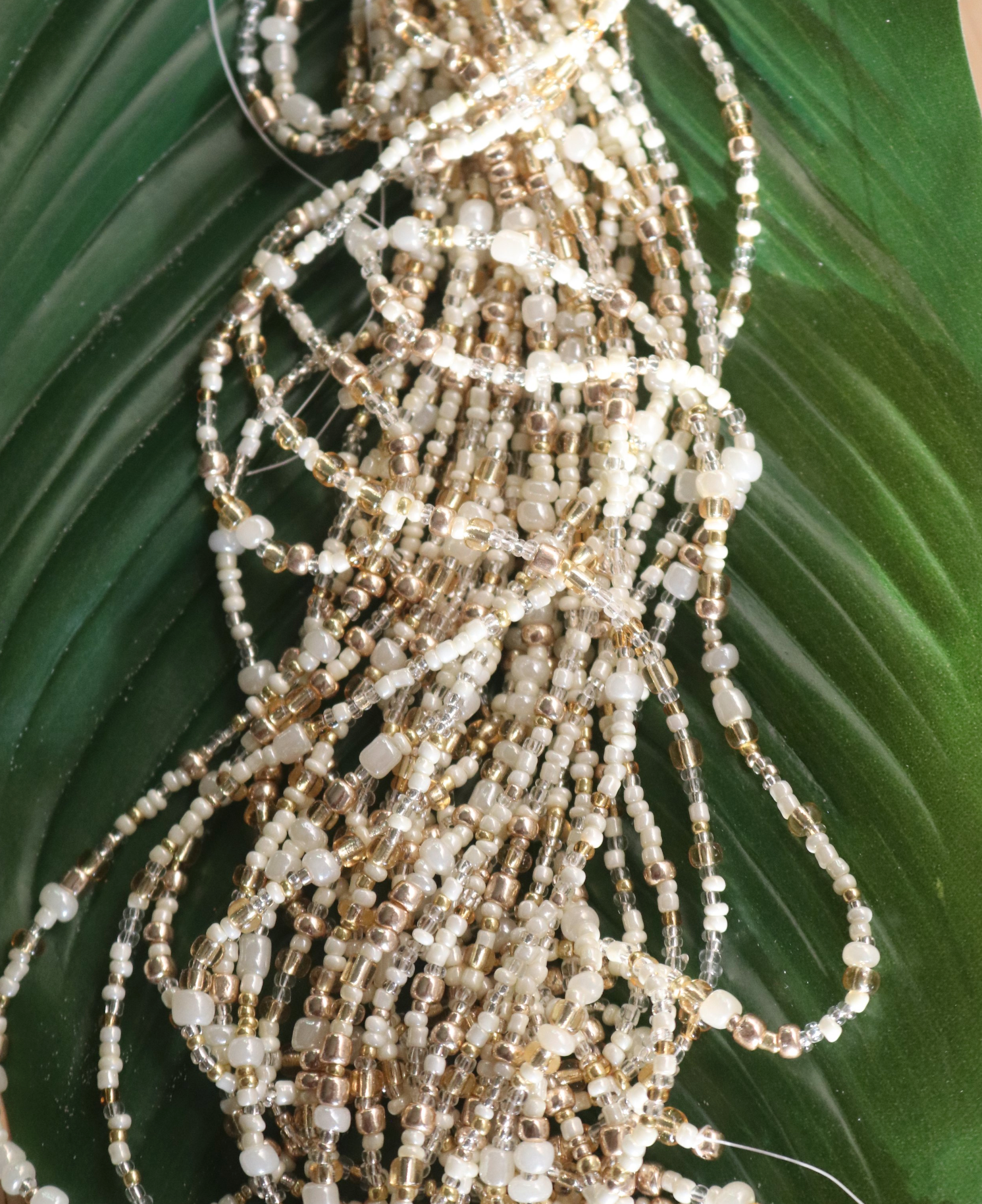 Introducing Adamma - the perfect waist bead strand for the vibrant and confident woman who loves to make a statement. Named after the Igbo word for "beautiful daughter", Adamma is a luxurious and elegant piece that will add a touch of glamour to any outfit. This stunning strand is a perfect combination of multiple white and gold beads, with intricate beadwork that will bring out the goddess in you.